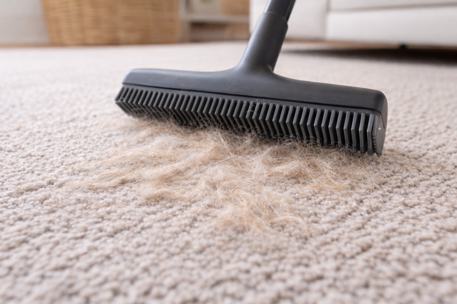 Use a rubber broom or rubber pet hair remover on carpets and furniture. It pulls embedded hair in seconds and works better than standard vacuums for heavy shedding.
